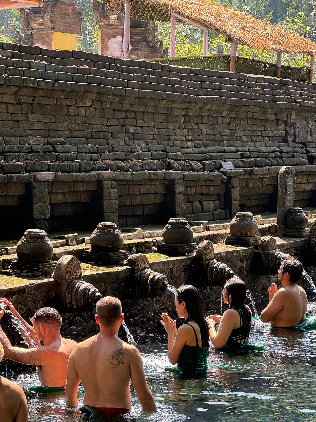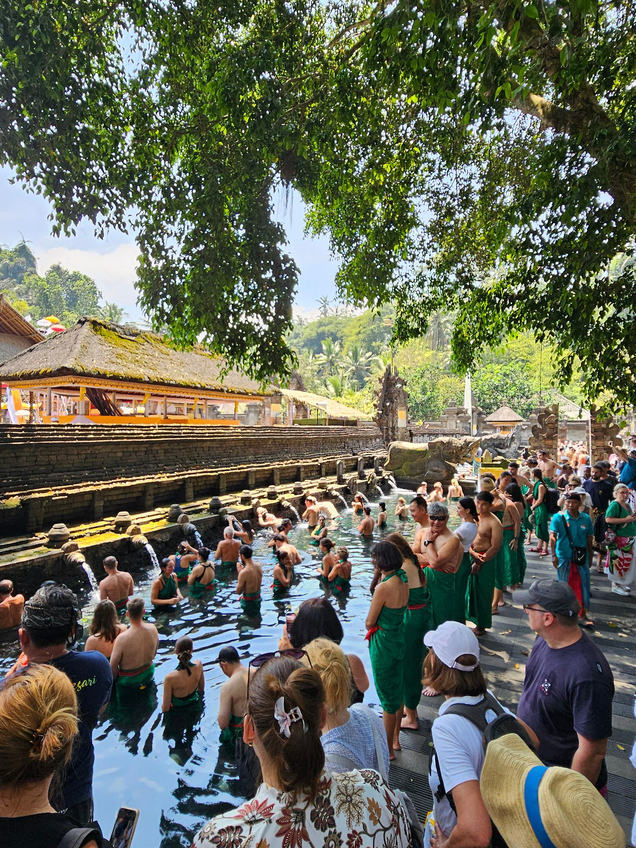 정화 의식 체험을 하려면 의식용 사롱을 다시 빌려서 갈아입어야 한다. (1인 1만 루피아로 기억) 초록색 사롱으로 갈아입고 물에 들어가 물줄기를 하나씩 거치며 정화 의식을 치른다. 성스러운 물이 몸과 마음을 정화해 주고 소원을 들어준다고.