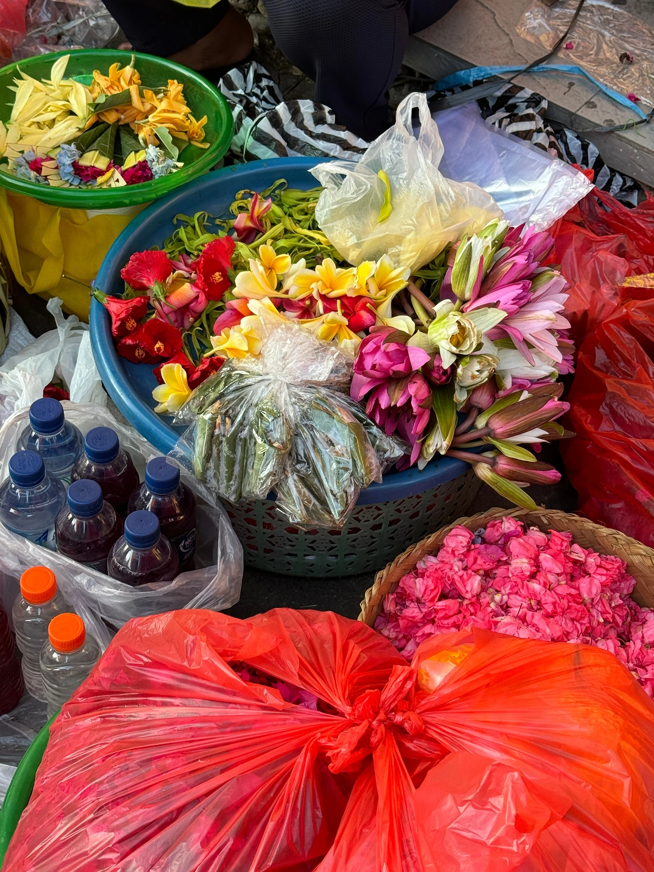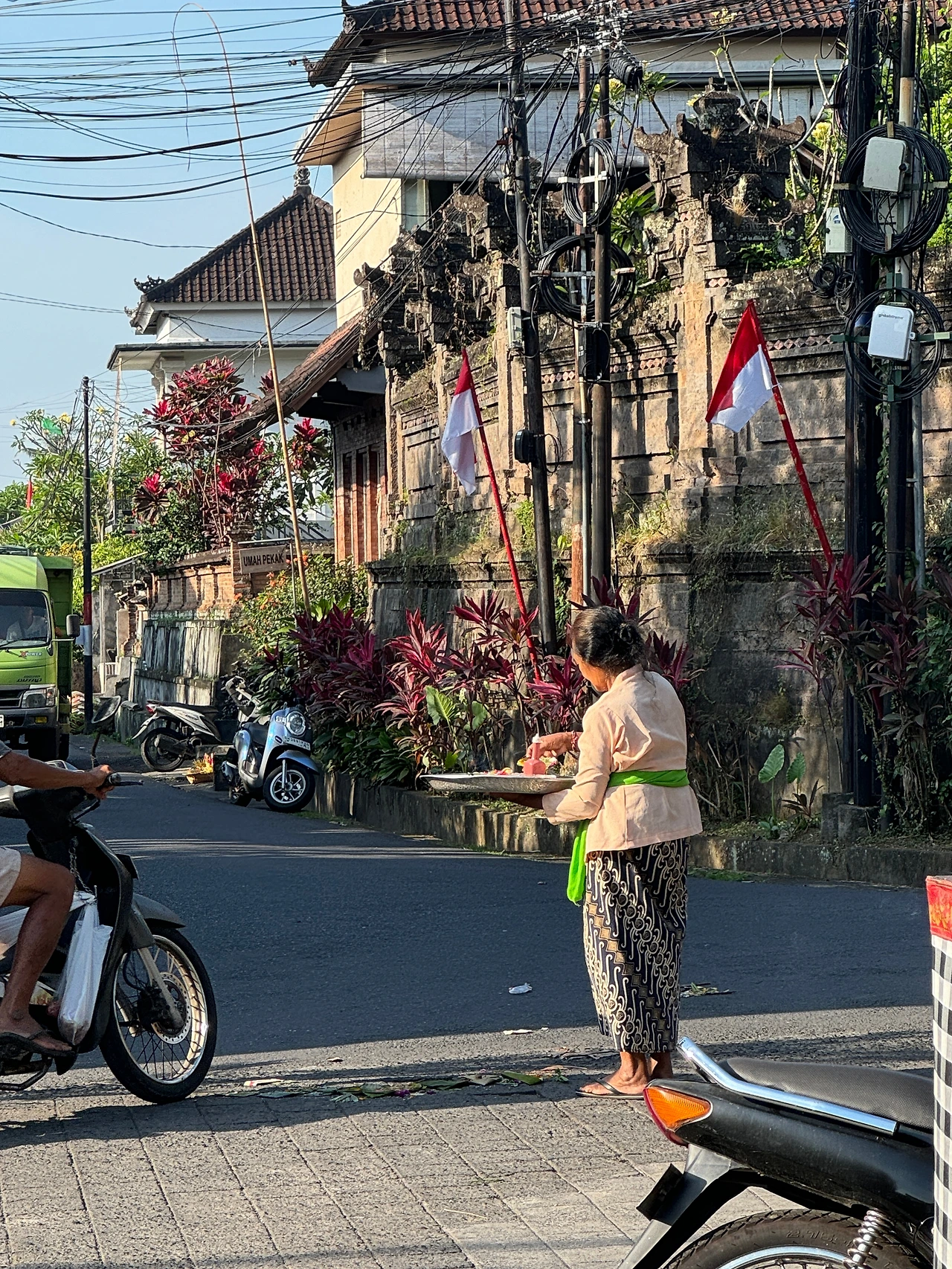 *짜낭 사리 : 신에게 바치는 봉헌물. 제단이나 상점, 오토바이, 차 등등 여기저기에서 짜낭 사리를 볼 수 있다. 바닥에 놓인 건 신이 아닌 악귀를 막기 위한 용도라고 한다.