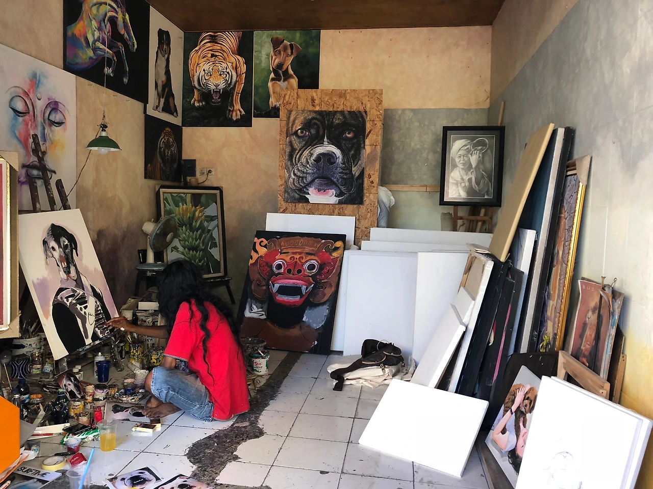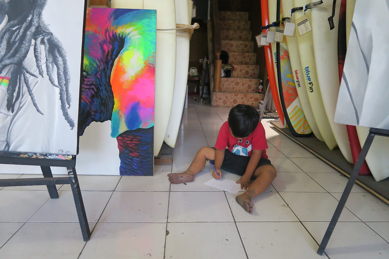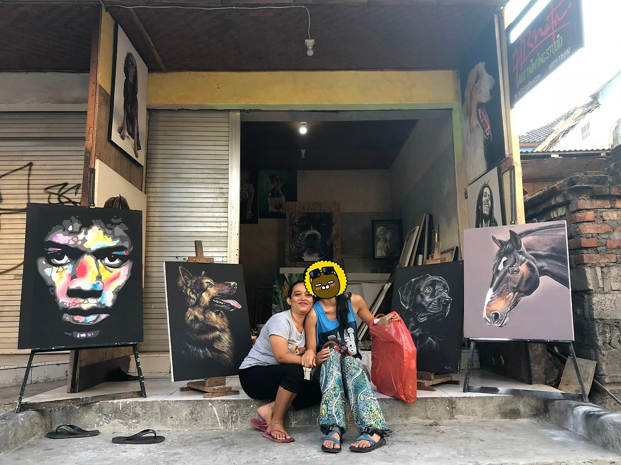 혼자 꾸따 시내를 걷다가 아리의 작업실을 지나가게 되었다. 그림 그리는 걸 좋아하는 걸음을 멈추고 아리가 그림 그리는 모습을 하염없이 바라봤다. 그런 나를 발견한 아리는 가까이 와서 봐도 된다며, 자기 작업실 공간으로 나를 초대했다. 그 후로 아리의 작업실은 참새 방앗간 같은 곳이 되었다.