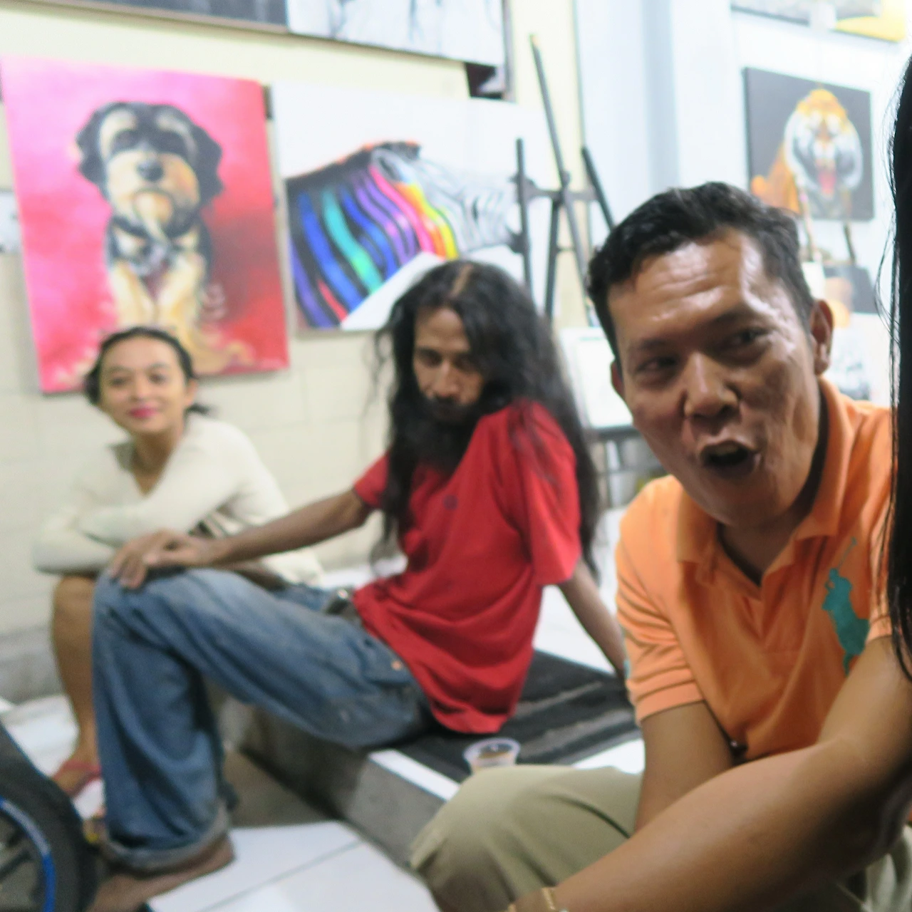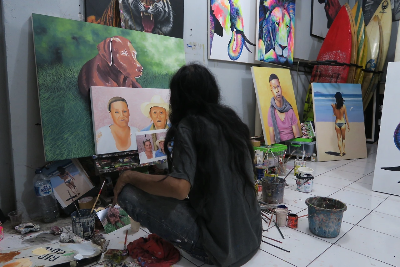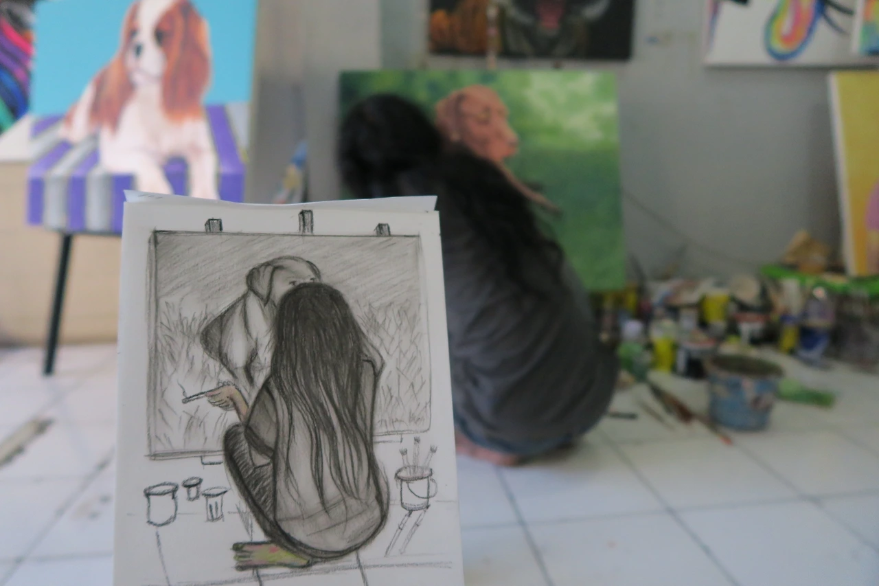 혼자 꾸따 시내를 걷다가 아리의 작업실을 지나가게 되었다. 그림 그리는 걸 좋아하는 걸음을 멈추고 아리가 그림 그리는 모습을 하염없이 바라봤다. 그런 나를 발견한 아리는 가까이 와서 봐도 된다며, 자기 작업실 공간으로 나를 초대했다. 그 후로 아리의 작업실은 참새 방앗간 같은 곳이 되었다.