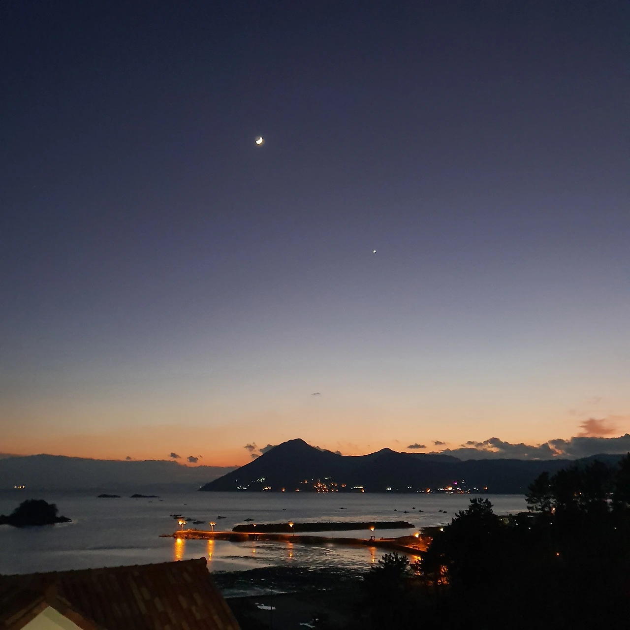 독일마을에서 맥주에 학센하며 반나절의 시간을 보내고 숙소로 돌아가는 길, 밤하늘이 예뻐서 잠깐 차를 세우고 내려서 본 밤바다의 풍경이 한줄기 빛처럼 내 마음안에 들어왔다. 때로는 좋은 숙소, 비싼 음식이나 유명한 관광지보다 스쳐지나갈 수 있는 사소한 것들이 깊게 마음을 움직이기도 하는 법이란 걸 이 풍경을 보고 알게 되었다. 꼭 여행을 가지 않았더라도 이미 내 곁을 거쳐갔거나 지금 머무르는 많은 것들을 놓치고 있는건 아닐지, 하는 생각도 이 밤바다를 보며 잠깐 했던 것 같다. 탁트여 시원한 맛이 없어서 동해바다가 더 좋다던 남편과는 달리, 나는 시선이 머무는 곳곳에 섬과 나무가 걸리는 남해가, 어딘가 사연과 서사가 있어보여 꼭 마음에 들었다.