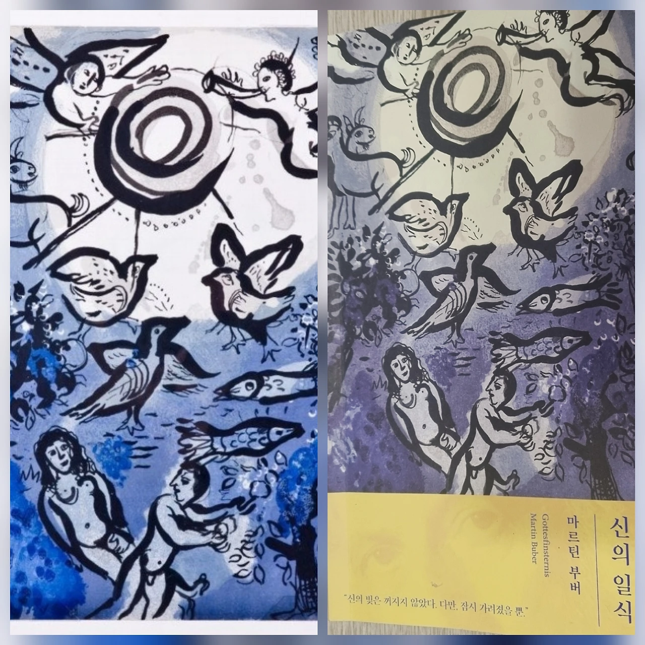 이 이미지는 책에 대한 나의 잔상이다. 풍경 묘사가 아니다. 그런데 이 상상과 부버가 이 책을 서술하게 된 배경을 연결하면 이 책의 색조가 떠오른다. 바로 표지의 색상이다. 샤갈의 원조에서 유채색이 탈색된 무채색이다. 이 탈색은 이 책의 기본 논조와 맞닿아 있다.