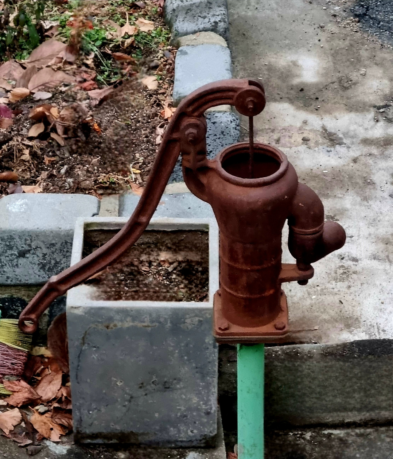 프레임 안에는 콘크리트 경계석, 말라붙은 흙, 낙엽, 그리고 아래로 이어지는 초록색 관이 함께 들어와 있었다. 낡은 철과 새 플라스틱이 한 몸처럼 이어져 있는 장면은 이 사진의 숨은 중심축이다. 오래된 것과 새것이 공존한다기보다, 새것이 오래된 것을 대신하면서도 끝내 지우지 못한 상태가 남아 있기 때문이다. 그 애매한 접합이 “시간이 겹쳐진 장소”를 만들어낸다. 따라서 이곳은 단순히 오래된 사물이 남아 있는 자리가 아니라, 살았던 방식이 뒤섞인 자리다.