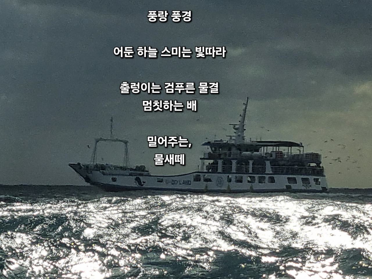 사진과 시어는 멈춤과 전진이 동시에 일어나는 하나의 사건을 가리킨다. 풍랑 속 전진은 자력만으로 성립하지 않는다. 나는 이 디카시가 어두운 하늘과 거친 풍랑 앞에 놓인 배가 “무사히 목적지에 안착한다.”라는 희망을 무심코 말하고 싶지 않았다. 또한, 아무리 힘들어도 자기 힘으로 직선을 벗어나지 말고 전진하라는 강요를 피하고 싶었다.