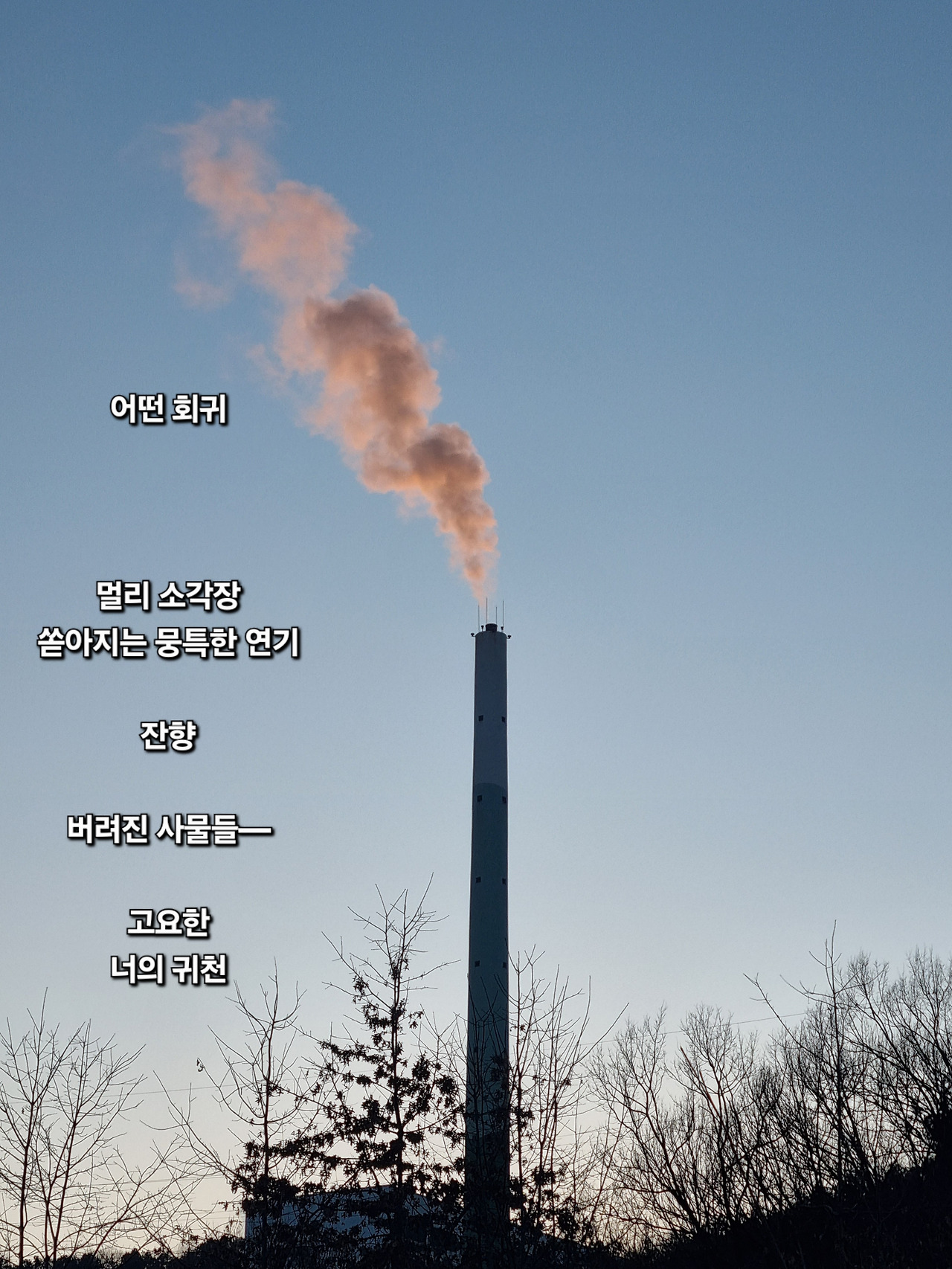 결과적으로 이 디카시는 삭막할 수 있는 산업 현장의 풍경을 따스한 철학적 시선으로 어루만지려는 나의 의도가 잘 담겼다. 가장 추웠다는 캠핑장의 아침, 멀리서 뭉툭하게 쏟아지는 연기를 보며 가볍게 '귀천'하는 어느 사물의 모습이 미래의 나의 자화상일지도 모르겠다.