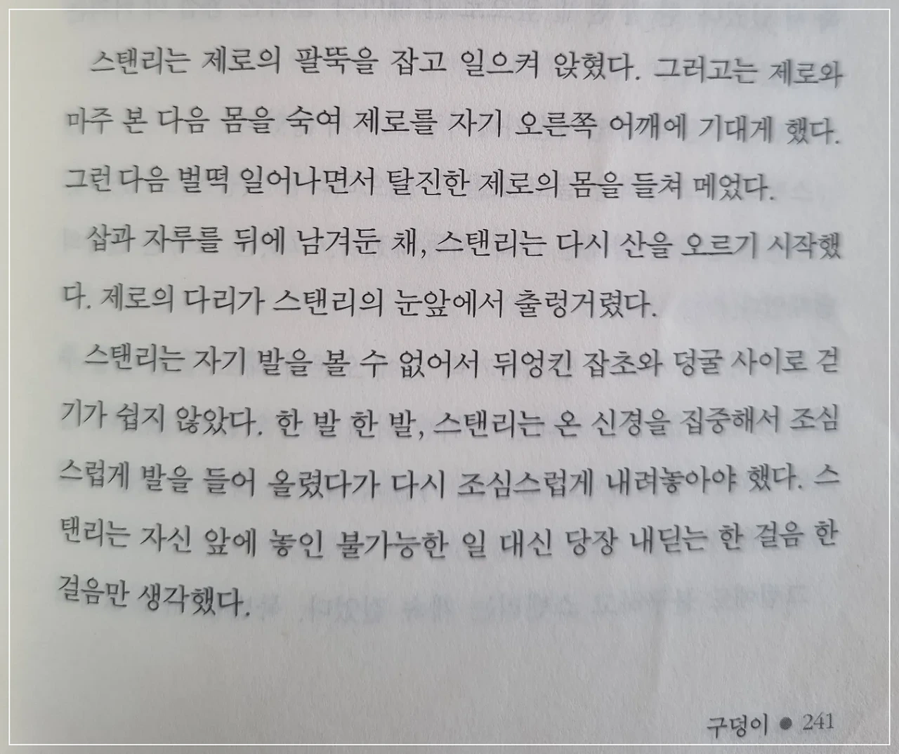 스탠리는 자신 앞에 놓인 불가능한 일 대신 당장 내딛는 한 걸음 한 걸음만 생각했다(구덩이. 루이스쌔커. 창비출판).