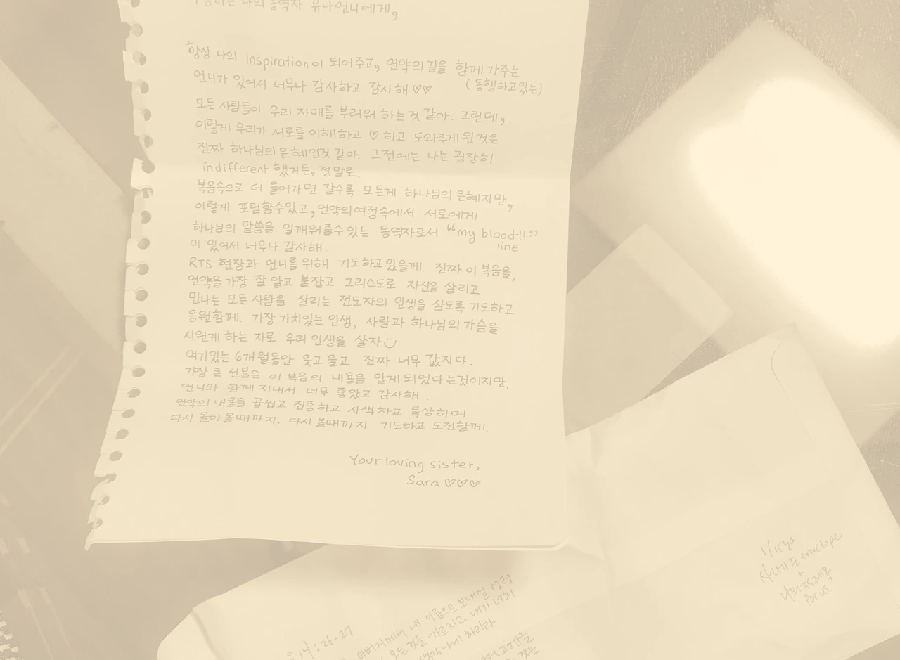 유학시절 기억에 남는 기록이 몇 있다. 처음 뉴욕으로 떠나는 날, 나와 가족들은 짐을 아빠 차에 싣고 있었다. 여동생은 울면서 집에서 뛰쳐나와 봉투를 하나 쥐어주곤 다시 집으로 들어갔다. 공항에서 열어본 그 봉투 안에는 편지와 돈이 들어있었다. 방학 때마다 집에 갔다 다시 미국으로 돌아올 때면 동생은 내게 편지를 건넸다.