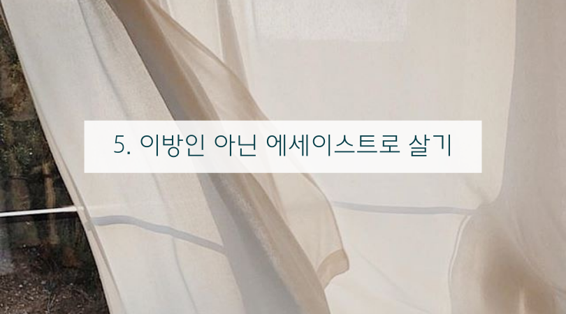 언뜻 보기에는 이방인이지만, 그 속을 자세히 들여다보면 각자의 이야기가 있다. 이민자들은 그리운 고향과 보고픈 얼굴들을 마음에 묻고 살아간다. 어디에서 어떤 모습으로 어떻게 살아가든지 간에 자신만의 이야기를 에세이로 표현하며 사는 사람이라면, 그는 이방인이 아닌 에세이스트이다.