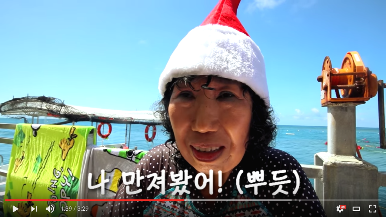 현재 활동하는 유투버들보다 훨씬 인생 경험이 많은 그녀의 지긋한 나이 때문도 아니고, 서울이 아닌 지방색이 강하기 때문에 욕마저 정감 있게 들리는 시원시원한 사투리 때문만도 아니었다. 누군가가 자신을 바다 깊은 곳으로 밀었다면서 힘든 표정을 지으실 때나, 헬멧 쓰고 들어간 바닷속에서 만난 물고기들이 너무 신기하다며 감동의 눈빛을 하실 때, 나는 그녀의 진심에 감명받았고, 그 진심을 전달하는 바닷물처럼 투명한 그 마음에 동요되었다.