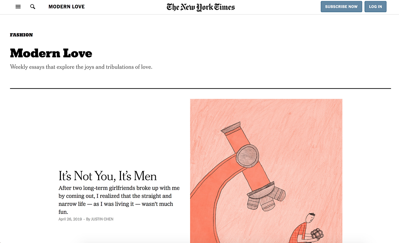 뉴욕타임스의 칼럼 중에서 매우 유명한 모던 러브입니다. 매일은 아니지만 꽤 자주 콘텐츠가 올라오고 있어요. 주로 작가 지망생, 작가, 일반인, 아티스트 등이 뉴욕타임스에 사랑 (그리고 관계) 에세이들을 직접 제보합니다. 이성의 사랑도 있지만, 가족 간의 사랑도 다루어요. 유명한 이야기 중에는 You May Want to Marry My Husband, What Shamu Taught Me About a Happy Marriage 등이 있어요.