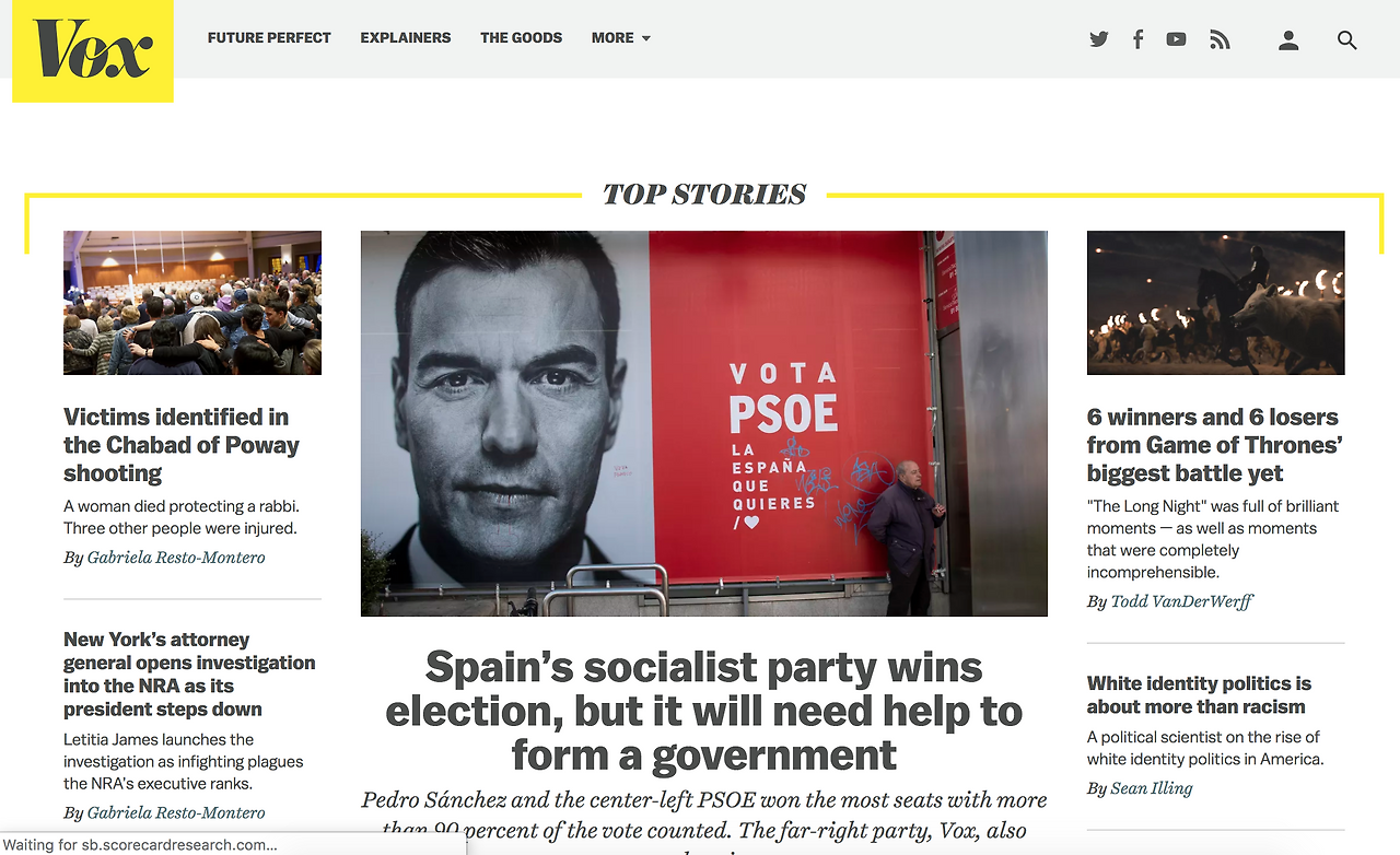 뉴스계의 거장들 NYT나 Washington Post, 그리고 Huffpost뿐만 아니라 샛별이라고 하기에는 너무나도 반짝거리는 VOX도 좋아요. 2014년에 시작된 해설 언론 Explanatory Journalism이에요. 지금 세상에서 어떤 일이 일어났는지 독자들에게 설명하는 미션을 가지고 있지요. 복스의 영상 콘텐츠도 매우 유명한데요, 최근에는 넥플릭스와 함께 Explained이라는 다큐시리즈를 제작하기도 했지요. 다른 여타의 웹진, 뉴미디어 회사들처럼 팟캐스트도 진행합니다. 매일 나오는 Today, Explained라는 팟캐스트가 대표적 뉴스 팟캐스트이네요.