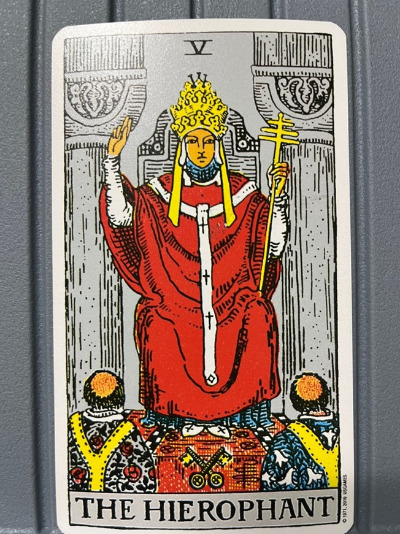 3대 짬뽕 맛집, 돌려차기 4대 천왕 하는 식으로 타이틀을 붙여 권위를 확보하려는 귀여운 시도를 좋아한다. 나 역시 취향을 정립해가는 과정에서 ‘나다움’을 구성해도 괜찮을 것 같은 사물을 편애하고 그 사실을 주위에 알리길 좋아하는 경향이 있다. 예를 들면 ‘내가 좋아하는 물의 맛은 아이시스 8.0이야’ 하고 이 물 저 물이 범람하는 세계에서 물맛 좀 아는 사람 행세를 하기도 하고, 얼마 전 동묘 근처에서 양꼬치를 먹으면서는 ‘이 맛은 인생에서 가히 세 손가락 안에 들겠는걸’ 하고 생각하기도 했다. 그런 점에서 5번 교황 카드를 보면 그간 잠시 글쓰기가 뜸했던 이유를 찾을 수도 있을 것 같다. 나에게 14번 절제 카드(TEMPERANCE), 18번 달 카드(MOON)와 함께 교황 카드는 단연 밉상 3인방 중 하나인 카드다. 세 카드의 공통점은 실제 리딩에서 ‘뭐 어쩌라고’ 같은 반응을 불러일으킨다는 것이다. 잦은 이사, 과로 등 여러 일들이 겹쳐 미루고 미루다가 이제야 5번 카드 이야기를 이어가게 된 그간의 공백도 어쩌면 교황 카드의 밉상력이 보태졌기 때문일 터, 하지만 이제는 이 카드와 대면해 보자.