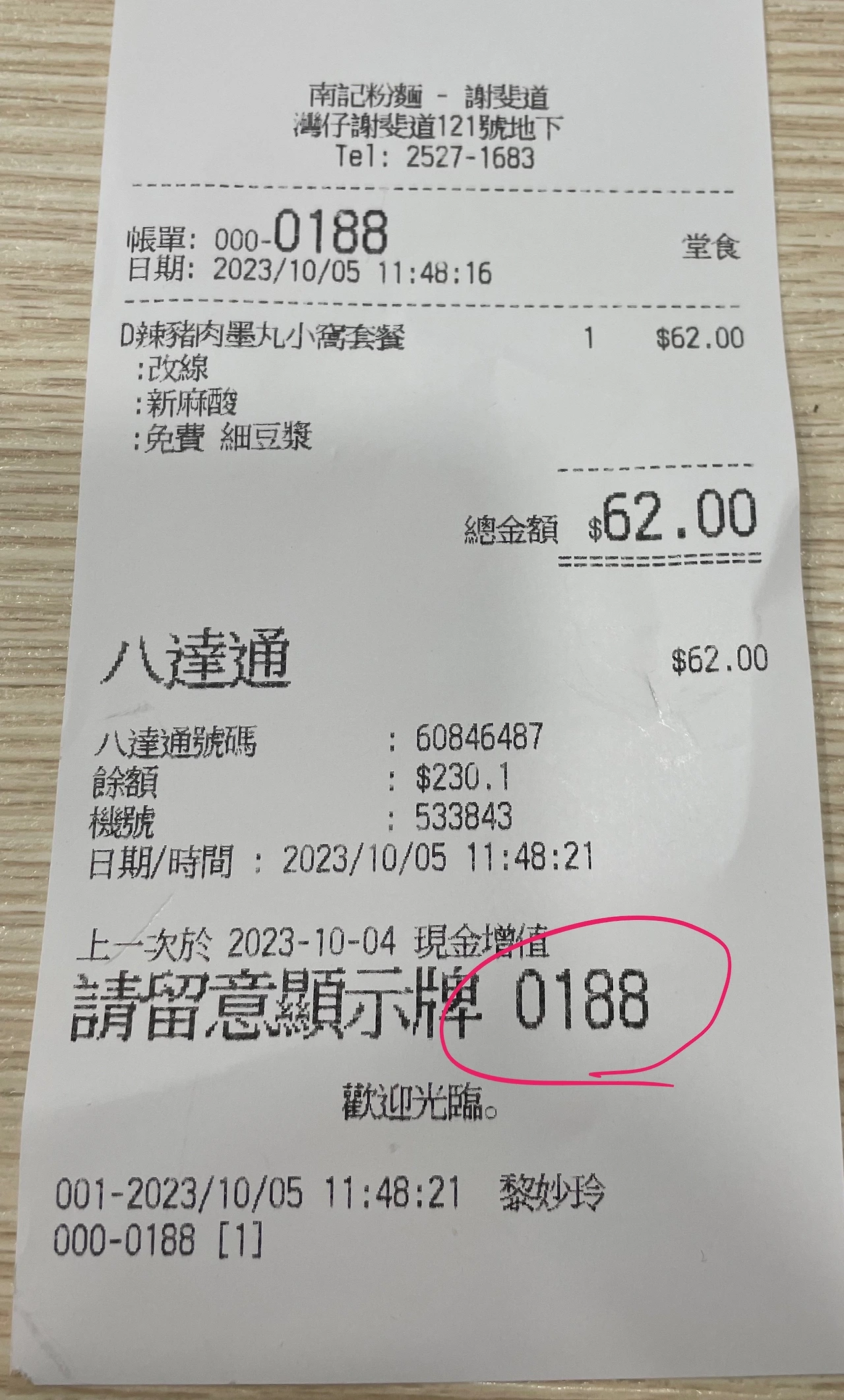 계산서에 있는 번호표를 들고 게시판을 초조하게 지켜보다가 내 번호가 나오면 배식구에 가서 내 번호 보여주고 주문이 맞게 나왔는지 확인해 본 뒤에 가져오면 된다.