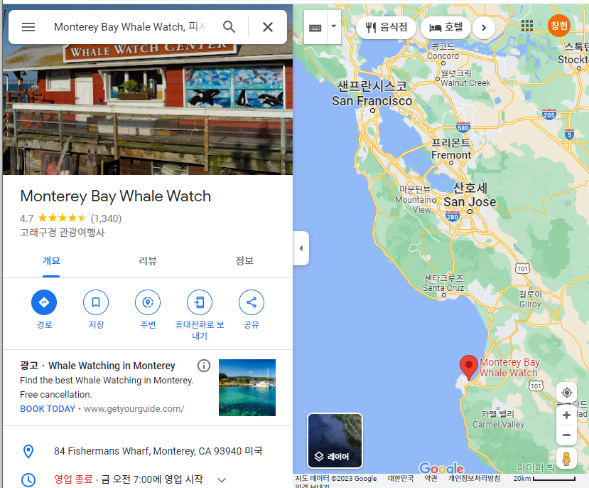 이것저것 검색을 해보니 샌프란시스코는 가끔 길을 잘못 든 고래들이 출현했고 샌프란시스코 근처 도시에 아예 고래를 관찰할 수 있는 투어가 있었다. 몬테레이라는 도시였다. 신기하게도 멕시코 출장에서 방문한 도시와 이름이 같았다. 출장으로 정신없는 와중에도 투어를 예약했다. 시간은 3시간 정도 걸린다고 했다. 오전, 오후 2타임이 있었고 3개 정도의 업체가 있었다. 보통 저렴한 쪽을 선택하지만 어지간히도 잘 없는 나의 희망 사항 중 하나라 비싼 쪽으로 예약을 했다.