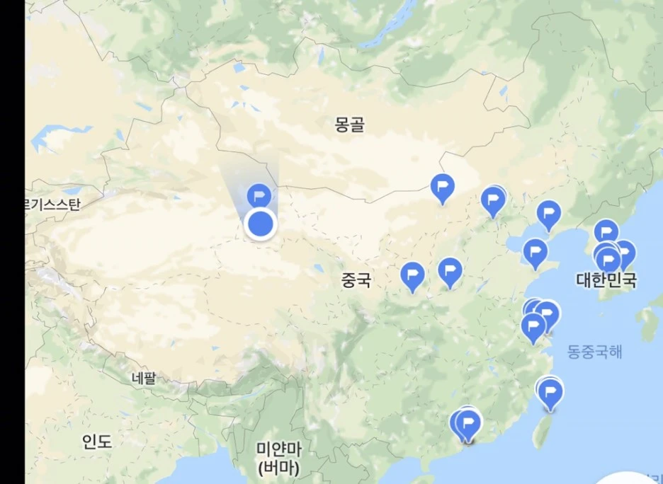아래의 지도에서 가장 왼쪽의 깃발이 둔황의 위치이다. 비슷한 높이의 우측 깃발이 내몽고이다. 그리고 그 내몽고의 약간 우측 하단의 깃발이 북경의 위치이다. 한국에서부터 거리를 계산하는데 참고하면 좋겠다. 비행기 역시 직항이 없기 때문에 북경에서 한번 갈아타야 한다. 아예 넉넉하게 북경을 1박 2일 맛보는 것도 좋다. 나는 북경에 두 번 갔는데 두 번 다 하루만 체류했다. 개인적으로 왠지 북경은 정이 안 간다. ㅋㅋㅋ