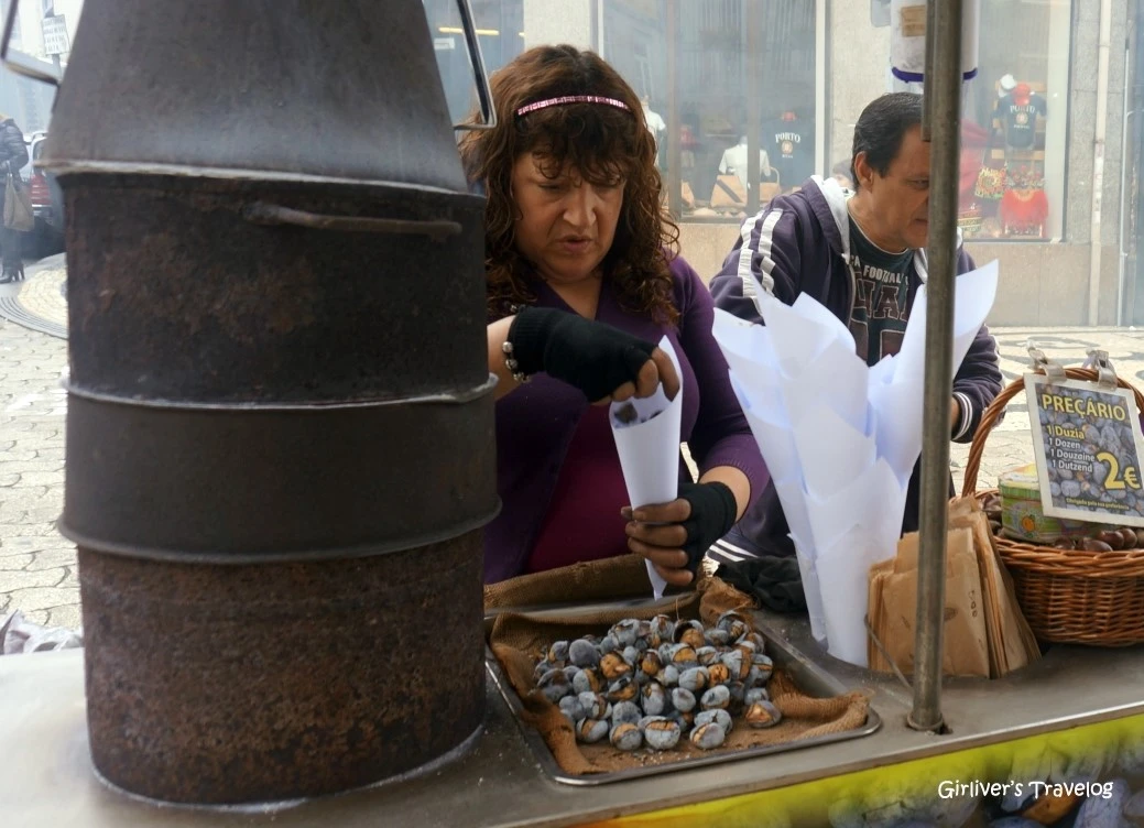 토요일이라 붐비는 것은 벼룩시장만이 아니다. 쇼핑거리인 산타 카타리나(Santa Catarina) 거리에는 오가는 사람들도 많다. 점심시간이 훨씬 지나 출출한데 마침 군밤 파는 노점이 있다. 커다란 통에 구워 A4용지에 담아주는 군밤은 2유로다.