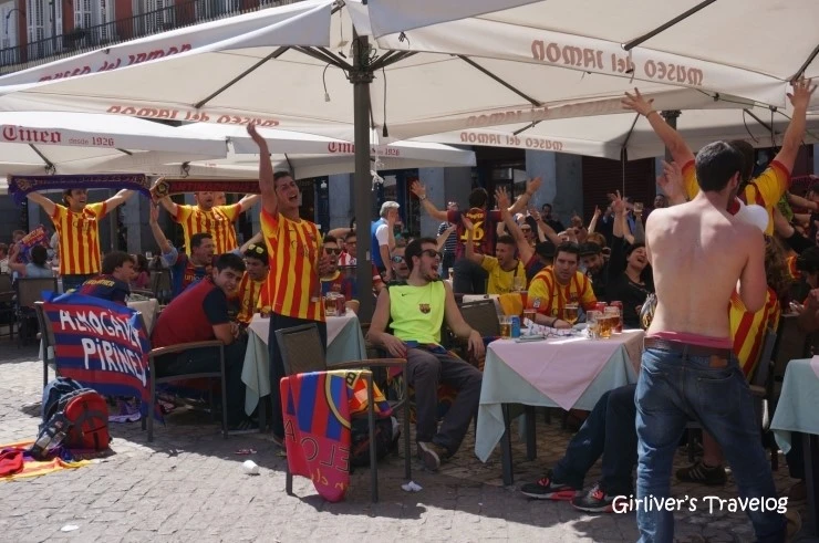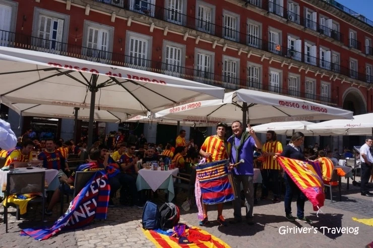 FC바르셀로나의 응원 팀들이 마요르 광장의 노천 카페 하나를 차지하고 있다. 과연 프리메라리가(Primera Liga)의 나라 스페인답다. 아직 오전인데도 저렇게 모여 맥주 마시며 열정적인 응원구호를 외치고 있다. 오늘은 수요일, 일도 안하나 싶지만, 축구를 너무 사랑해서 하루 쉬고 바르셀로나에서 마드리드까지 응원 온 사람들일 수도 있겠다. 그 열정이 광장을 쾅쾅 울린다.