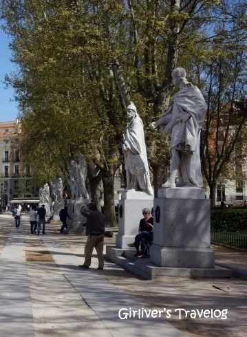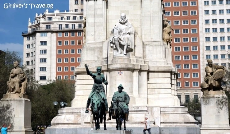 기념비는 도심이 시작되는 곳이라 현대적인 건물들로 둘러싸여 있는데도 주변과의 조화로움에 눈길이 간다. 기념비 뒤의 스페인 빌딩은 이 기념비와 같은 비례로 지어졌다고 한다. 작은 연못에는 이들의 동상이 다시 비춘다. 분수대 앞 벤치에 앉아 사람들을 바라본다. 의자에 앉아 조용히 햇볕을 쪼이는 사람들은 마드리드 사람들이고 돈키호테와 산초 앞에서 사진을 찍어대는 사람들은 관광객이다.