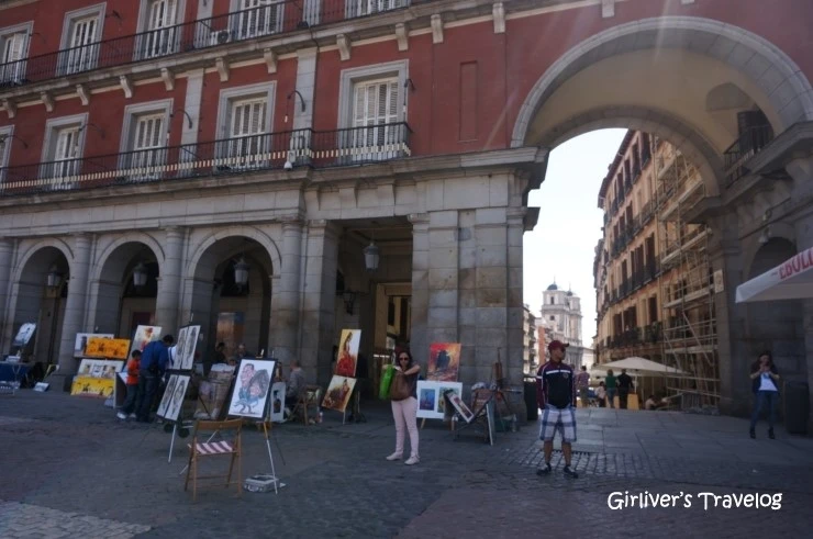 광장에서 바깥을 연결하는 둥근 아치형의 문들은 아홉 개나 된다. 이 문들을 따라 밖으로 나가면 마드리드의 뒷골목들이 펼쳐진다. 어느 건물은 보수공사 중이기도 하고, 아침이라 문을 열지 않았지만 선술집이 늘어선 골목도 있고, 각종 기념품 가게들이 여행자를 유혹하기도 한다. 문을 들락거리며 광장을 돌아본다.