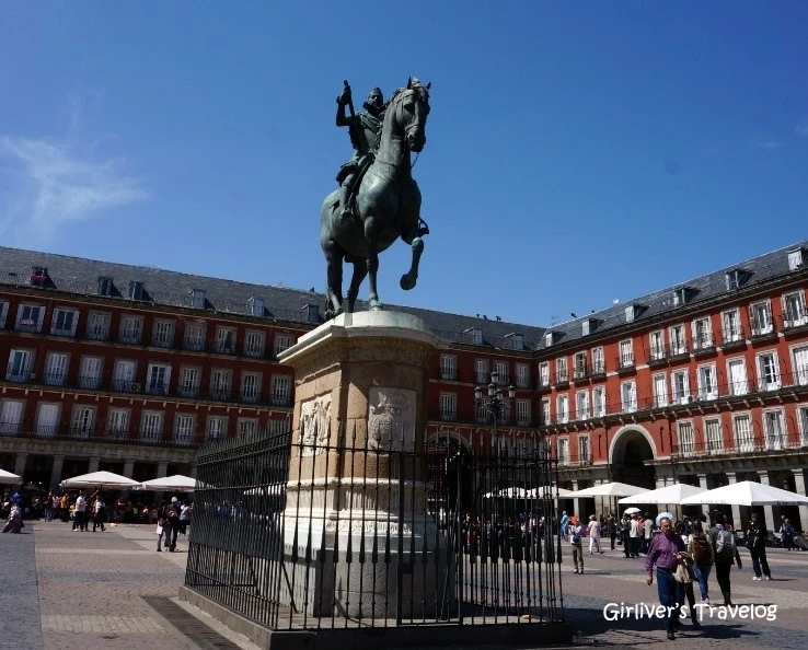 마요르 광장의 중심엔 펠리페 3세의 기마상이 있다. 이 펠리페 3세가 바로 마요르 광장을 세운 왕이다. 중세엔 이 광장에 날마다 장이서고 공연, 승마, 투우 경기도 열리고 사형도 집행하는 야외 행사장으로서의 역할을 톡톡히 했고, 지금도 주말 벼룩시장이나 각종 축제가 열리는 등 그 역할이 계속된다고 한다. 오늘 같은 평일 오전에도 축구 응원단의 함성이 광장에 울려 퍼지고 여행자들은 사진을 찍고 예술가들은 그림을 그리고 있다.