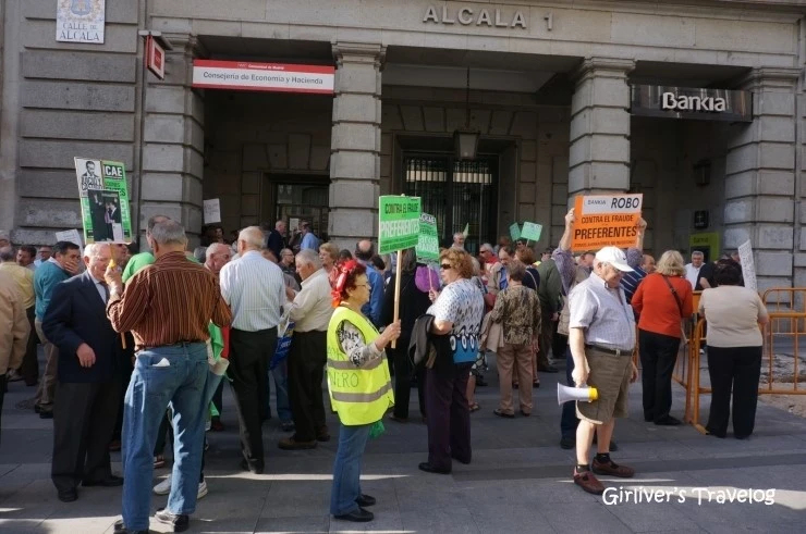 은행 앞에서 일단의 사람들이 몰려 시위를 하고 있다. 나는 여행자로 마드리드를 지나치고 기억하겠지만 마드리드 사람들에겐 삶의 터전이다. 여행자는 아름다운 풍경, 유서 깊은 장소, 특이한 소품들에 한 눈이 팔리지만 이곳에도 반복되는 일상이 있고, 열렬히 외쳐야 하는 처연한 삶도 있다.