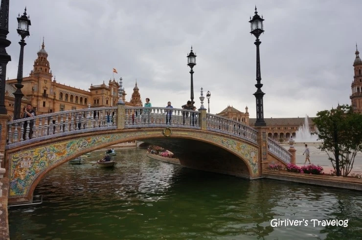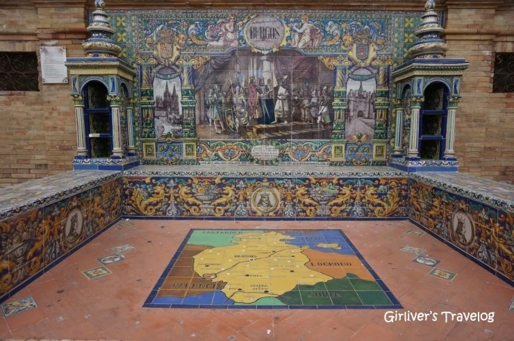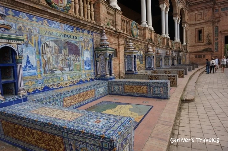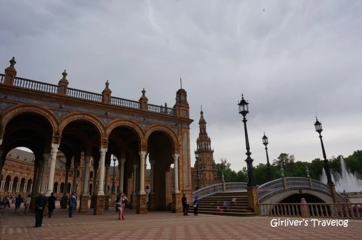 반달 모양의 광장에는 건물이 궁전처럼 늘어서 있고 그 앞에는 반달 모양 그대로의 수로가 있다. 수로를 잇는 아치형의 다리 또한 섬세한 타일로 이루어져 우아함을 자랑한다. 광장을 둘러싼 건물 벽에는 스페인 58개 도시의 휘장, 지도, 역사적 사건들이 화려하게 타일로 장식되어 있다.