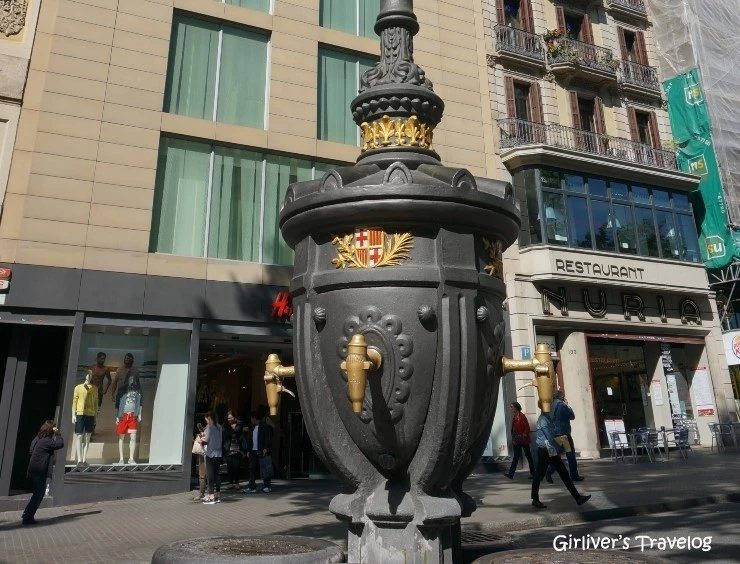 카탈루냐 광장의 아름다운 분수들, 비둘기들, 시티투어 버스와 많은 관광객을 지나쳐 람블라스 거리로 접어든다. "람블라(Rambla)"는 "물이 빠진 뒤의 강바닥"이라는 뜻인데, 카탈루냐 지방에서는 대로를 뜻하기도 한다. 카날레테스 람블라(Rambla de Canaletes)는 오래된 상수도의 이름을 딴 구역이다. 이 수도의 물을 마시면 바르셀로나에 다시 오게 된다는 속설이 있다고 한다. 축구팀인 FC바르셀로나가 우승을 하면 팬들이 이곳에 모여 우승을 축하하는 전통이 있는 곳이라서 더욱 유명하다.