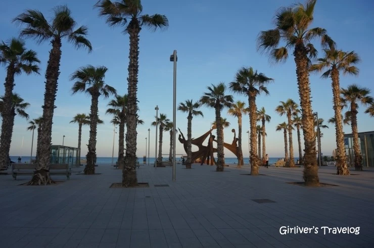 바르셀로나가 스페인의 동쪽 항구라서 해는 바다로 떨어지지 않는다. 야자수가 바람을 맞고 가로등이 예쁜 공원 같은 해변 풍경을 등지고 낙조를 바라보며 걸음을 옮긴다.