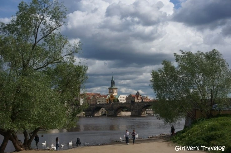 강변을 따라 내려왔기에 카를 다리 풍경을 바라보며 걸음을 옮긴다. 강가에 서 있는 사람들을 뺀다면 멀리 보이는 건물과 카를 다리와 블타바 강의 풍경은 13세기나 다름없을 것이다.