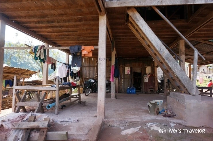 나무로 지어진 집은 더위와 홍수를 피할 수 있도록 기둥을 세우고 그 위에 지어졌다. 아래층 한 쪽에는 부엌과 화장실이 있고 계단을 올라가야 방이 있는 구조다. 평범한 라오스 가정이라서 엄마도 아빠도 영어는 단 한 마디도 하지 못하지만 젊은 엄마는 환한 미소로 여행자를 맞이하고 아빠는 외국인 여자들이 어색한지 떨어져 앉아 웃으며 인사만 한다. 아이는 아빠 옆에 꼭 붙어서 호기심 가득한 눈으로 손님들을 쳐다보며 눈만 깜박거릴 뿐 아무리 오라고 손짓을 해도 꼼짝도 않는다.