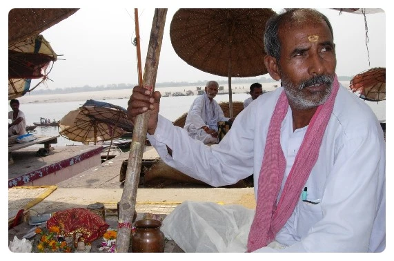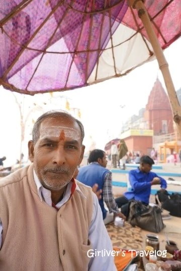 가트의 아침 풍경에 빠지지 않는 사람들이 있다. 평상에 대나무 파라솔을 세워놓고 힌두교도들에게 축복을 내려주는 사제들이다. 그들은 축복을 빌어주고 양미간에 티카도 그려준다. (힌두교도들은 아침마다 이마에 티카라는 표식을 그려 넣는다)
