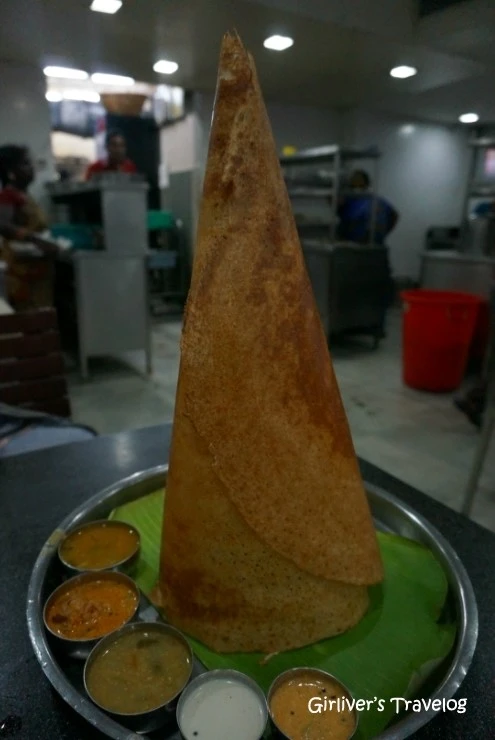 괜찮아 보이는 식당에 들어가 음식 추천을 받는다. 친절한 점원이 "도사(Dosa)"라는 남인도식 음식을 권해준다. 맛도 좋다. 확실히 북인도와는 다르다. 북인도는 밀가루가 주식이라 짜파티나 난을 먹는데 비해 남인도에선 쌀이 주식이라 쌀로 만든 도사를 먹는다. 그냥 접어놓아도 되는데 원뿔처럼 말아 세워 놓은 비주얼이 특이하다.