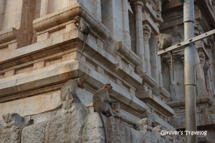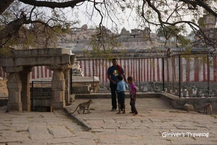 거리의 풍경 중에서 이방인의 눈에는 원숭이가 단연 돋보인다. 강아지보다 원숭이가 더 많은 거리다. 마치 개들처럼 자연스럽게 사람 근처를 돌아다니고, 돌로 만든 신전에 이리저리 올라가 있는 동물들이 바로 원숭이들이다. 어쩌면 함피는 사람보다 원숭이가 살기 좋은 곳 일 것 같다는 상상을 하며 미소를 짓는다.