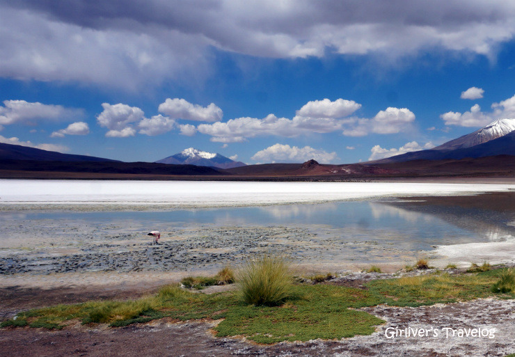 고원지대에는 하얀 호수(Laguna Blanca), 녹색 호수(Laguna Verde), 붉은 호수(Laguna Colorada) 등 색색의 호수가 있다. 호수마다 미네랄과 조류의 색이 다르기 때문이라고 한다. 하늘과 산이 내리비친 이 호수는 하얀 호수(Laguna Blanca)다. 이 높은 곳에서 소금을 원 없이 얻고 이런 색색의 호수들을 만난다는 게 신기하다.