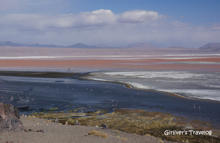 드디어 미네랄 성분 때문에 분홍색인 붉은 호수(Laguna Colorada)에 도착한다. 녹색 호수는 별 감흥이 없었는데 이 호수 빛은 진짜 신기하기만 하다. 호수에 거대한 그림물감을 풀어놓은 듯한 느낌이다. 멀리 하얀 점으로 보이는 것들을 차에서 내려 자세히 보니 그들은 새들이다. 바로 플라멩코다. 인적이 드문 고원의 파란 하늘 아래 분홍빛 호수에는 하얀 플라멩코들이 살고 있다.