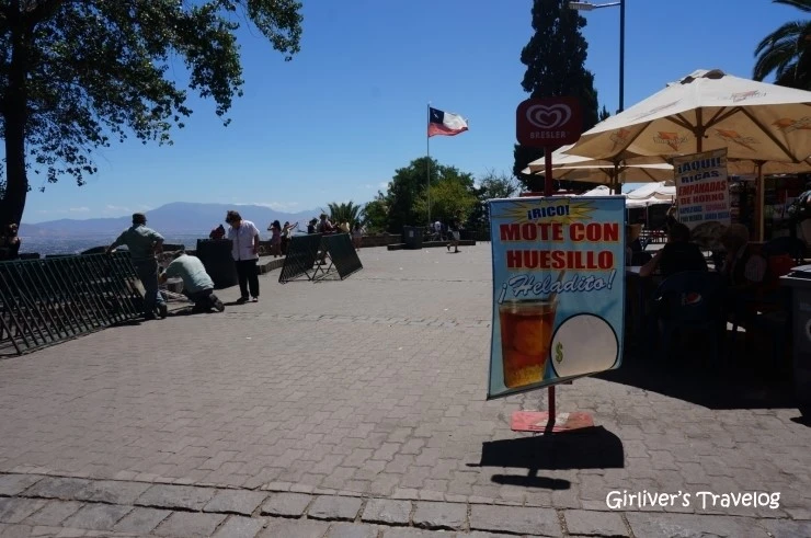 칠레의 거리 노점에서 많이 파는 복숭아 수정과 같은 모떼콘우예시요(Mote Con Huesillo)를 한 잔 사서 정상의 바람으로 땀을 식히며 한 잔 마신다. 이곳에 오르면 다들 마시게 되는 음료일 것이다. 평일이라 그런지 사람은 별로 없다.