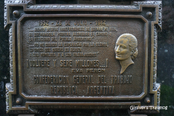 레콜레타에는 에바 페론의 묘소가 있다. 영화배우가 퍼스트레이디가 되었고 노동자와 서민을 위한 파격적 복지정책을 실현하다가 33세에 요절하였으니 그만큼 드라마틱한 삶을 찾기도 쉽지 않을 것이다. 이태리산 대리석으로 장식되어있다는 에바 페론의 묘소 앞엔 꽃이 시드는 날이 없지만 그녀에 대한 평가는 극단이다. 파격적인 복지정책으로 노동자와 서민에게 존경받았으나 포퓰리즘으로 경제를 피폐하게 했다는 거센 비판도 받는다. 가난한 사람들을 위해 살았다던 에비타가 아르헨티나 최고 부자들의 묘지에 묻혀 있다는 사실이 그 극단의 아이러니를 직설적으로 표현하는 지도 모르겠다.