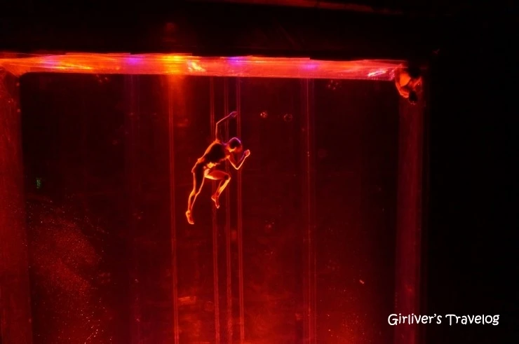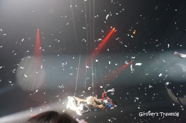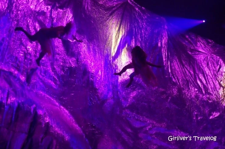 정작 무대는 객석 앞이었다가 뒤였다가 중앙이다가 하늘이 되기도 하고 손 닿을 수 있는 곳까지 내려앉기도 한다. 무대라는 인식조차 없는 차원이 다른 공연이다. 튼튼히 만들어진 유리나 아크릴 같은 투명한 막에 물을 채워 바로 앞에서 공연을 하기도 하고 어떤 무대장치인지 하늘에서 인간의 몸을 움직여 예술적인 장면을 연출하기도 한다. 연기자들이 하늘을 마구 날아다니기도 하고 우주의 끝에서 지구로 들어온 외로운 여행자 같은 퍼포먼스가 계속되기도 한다.
