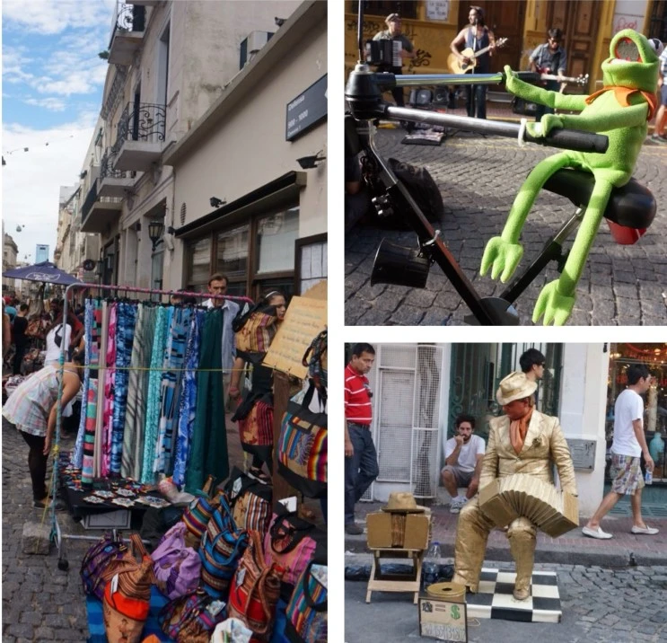 가죽 팔찌에 이니셜을 새겨주는 아저씨, 체 게바라를 그린 그림만 전시한 노점, 독특한 수제 지갑이나 가방 장수, 퍼포먼스 하는 사람을 구경하며 지나간다. 예쁜 핸드메이드 신발을 파는 가게에는 담배연기를 내뿜으며 한 손으로 담배를 든 아름다운 여인이 고혹적으로 앉아있기도 하다. 여기저기서 공연이 펼쳐지고 여행자들을 포함한 많은 사람들의 물결이 여태 본 모던(?)한 부에노스아이레스를 사라지게 하고, 투박하지만 활기 넘치는 모습으로 바꾼다.