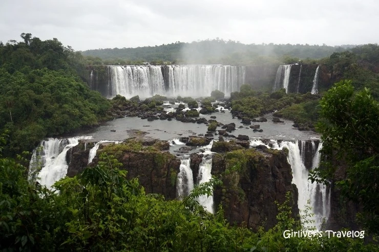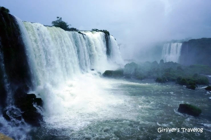 아르헨티나 이과수에서는 크고 작은 폭포의 모습을 여러 방향에서 조망할 수 있었는데 여기 브라질 이과수는 폭포의 모습이 한눈에 들어온다. 아르헨티나의 이과수 폭포들이 아기자기하게 여성적이라면 브라질 이과수 폭포들은 남성적이다. 예쁘고 화려한 풍경은 아르헨티나 쪽이고 브라질 쪽은 웅장한 스케일이다. 아르헨티나 쪽 폭포의 면적이 80%를 차지한다는데, 어쩐 이유인지 입장료는 브라질이 훨씬 비싸다.