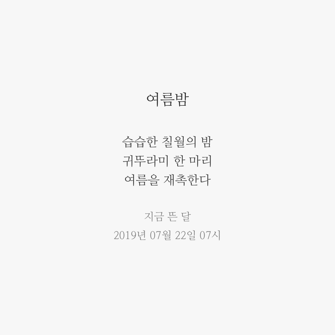 밤에도 뒤척이며 깨기를 두어 번, 자정이 넘은 시간. 서늘한 밤바람이라도 불까 창문을 열었다. 창문을 열자, 밤바람 대신 습한 여름밤, 풀들이 토해내는 흙내음과 한 마리의 귀뚜라미 울음소리가 들려왔다.