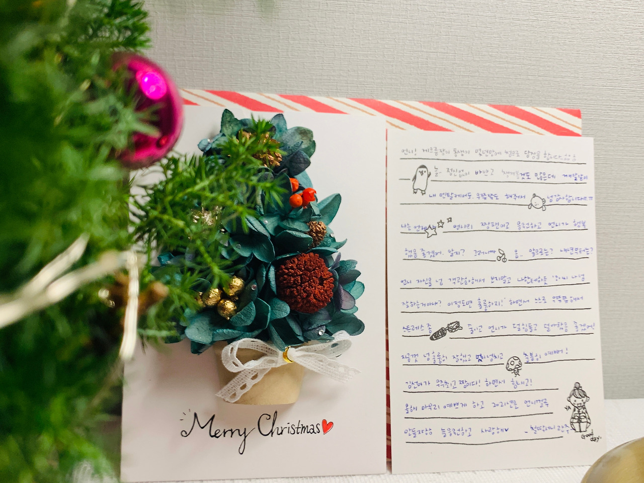 8살에 큰 이모에게 난생처음으로 크리스마스 카드를 받았다. 이모가 보내준 카드는 짙은 자주색의 벨벳 커버로 되어 있었고, 가운데에는 반짝이와 털실로 장식된 트리가 실물처럼 빛나고 있었다. 그리고 그 안에는 조카를 사랑하는 큰 이모의 마음과 고운 글씨가 새겨져 있었다. 뛸 듯이 기뻐하며 나도 큰 이모에게 크리스마스 카드를 보내고 싶다고 엄마를 졸랐고, 그 이후에도 몇 년간 나는 이모와 카드를 주고받았다. 매년 켄트지와 반짝이 풀로 직접 카드를 만들며, 이모가 기뻐하길 바라던 어린 시절은 평생 잊지 못할 기억이 되었다.