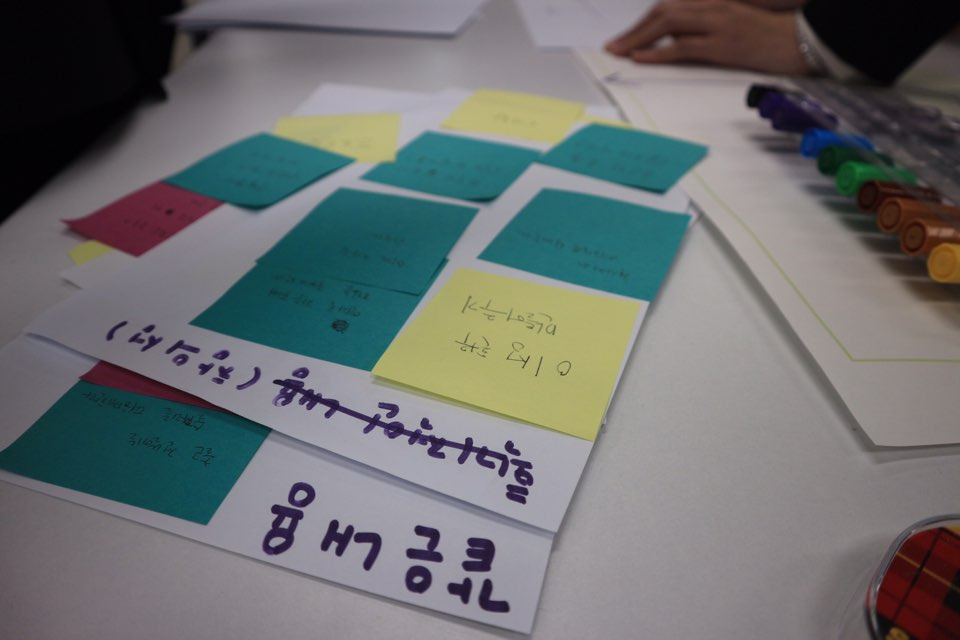 생각의 양이 충분히 나왔다고 생각된다면 비슷한 내용의 포스트잇을 모아 분류작업을 하도록 한다. 분류 과정에서도 또 다른 아이디어가 떠오른다면 즉각 생각을 추가해서 작성하면 된다.