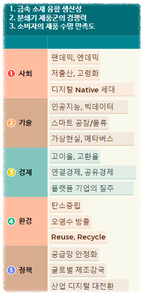 우리는 "사회", "기술", "경제", "환경", "정책" 분야에서 어렵지 않게 다음과 같이 객관적(?)인 트렌드를 도출할 수 있을 것이다. 자세한 내용은 아래 표로 대체하였다.