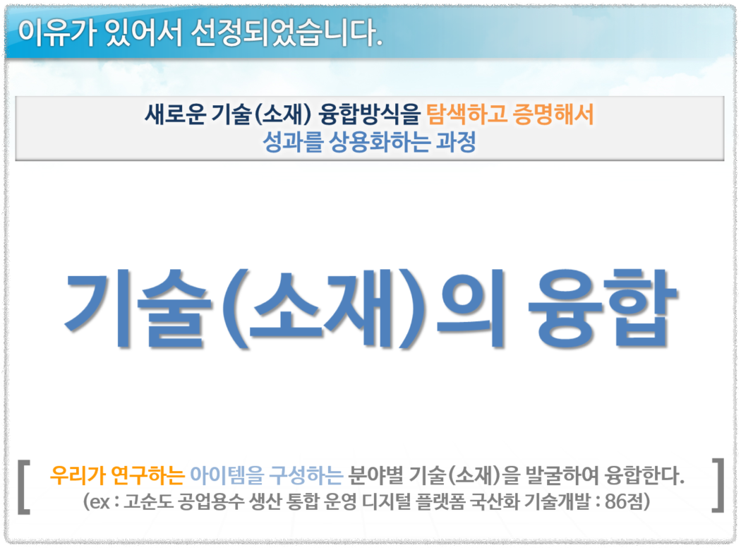 무려 86점을 받고 환경부 지원사업에 선정된 "고순도 공업용수 생산 통합 운영 디지털 플랫폼 국산화 기술개발" 과제. 국가연구개발사업에서 86점이면 거의 1, 2등을 다툴 만큼 높은 점수이다. 이 과제도 어김없이 기술의 융합과제이다. 고순도 공업용수 생산 관리 기술과 통합 플랫폼 기술을 모두 적용해야 하는 영역이기 때문이다. 생산 관리 기술을 모르고 생산 통합 운영 디지털 플랫폼을 구축할 수는 없으리라. 아무리 고민해도 우리의 연구개발 아이템을 연구개발 과제로 연계할 수 없다면 이 사례를기억하자.