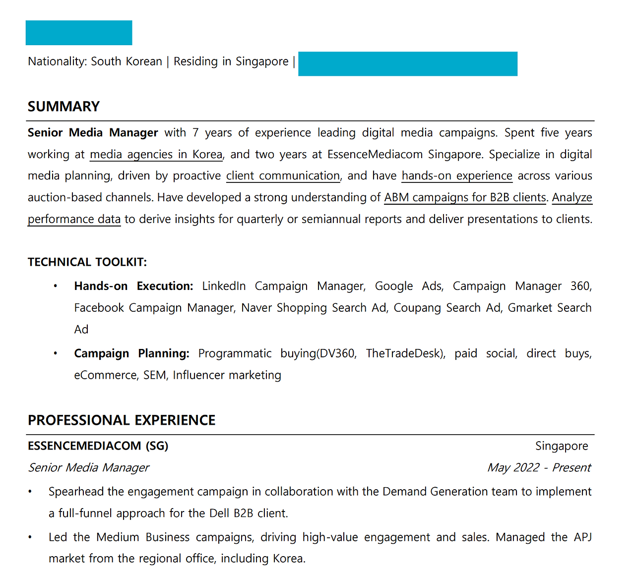내가 지원한 롤에 딱 들어맞는 사항들을 무조건 위에 배치했다. 예를 들면 싱가포르에 거주하면서도 한국 시장을 아는 사람을 원하기 때문에, Nationality: South Korean, Residing in Singapore와 같은 인적 사항을 상단에 넣었다.