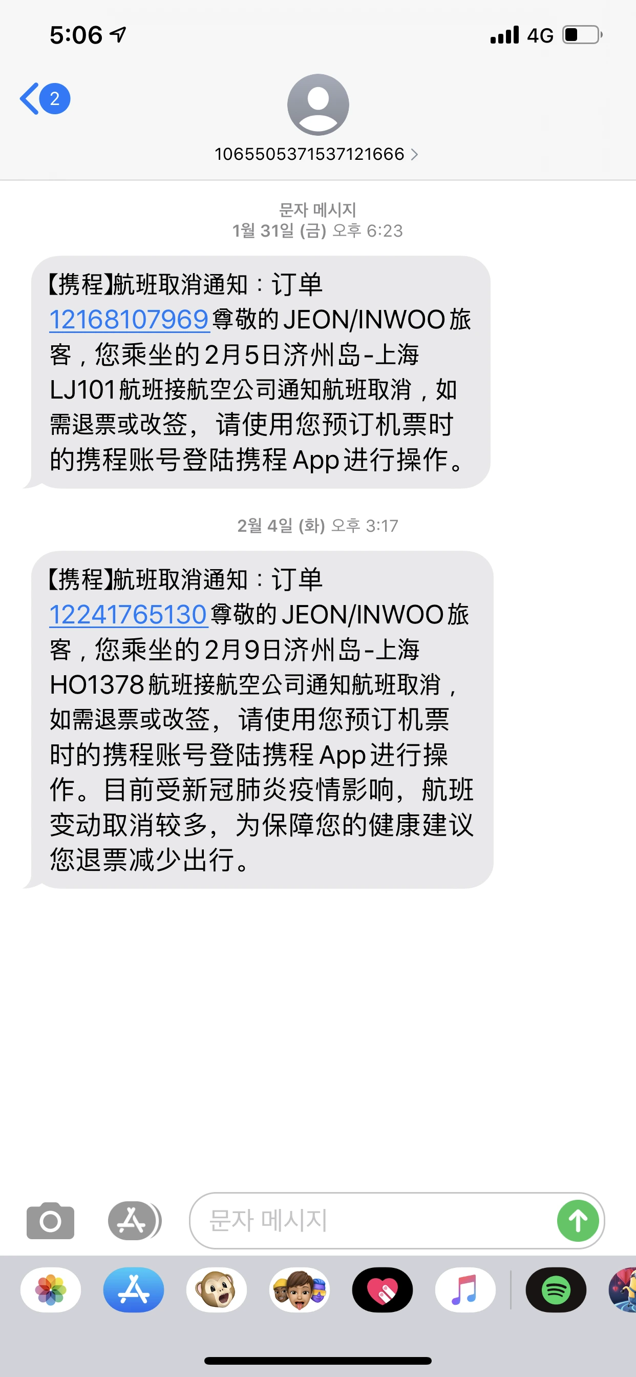 1월 29일 상해 푸동공항을 출발해 인천에 도착 후 서울에서 이틀 간의 시간을 보내고 31일 부모님이 계시는 제주도에 도착했다. 제주도에 도착한 날 저녁 2월 5일 상해로 돌아가는 항공편이 취소되었다는 메시지를 받았다. 이미 뉴스를 통해 중국 내 확진자가 엄청난 속도로 늘어나고 있다는 소식을 듣고 있었지만 항공편이 취소되었다는 메시지에 그 사태의 심각성을 더욱더 실감할 수 있었다. 2월 5일부터 8일까지 같은 편명의 항공 스케줄은 모두 취소된 상태라 2월 9일로 스케줄을 변경했는데 2월 4일 이 항공편 역시 취소되었다는 문자 메시지를 받았다.
