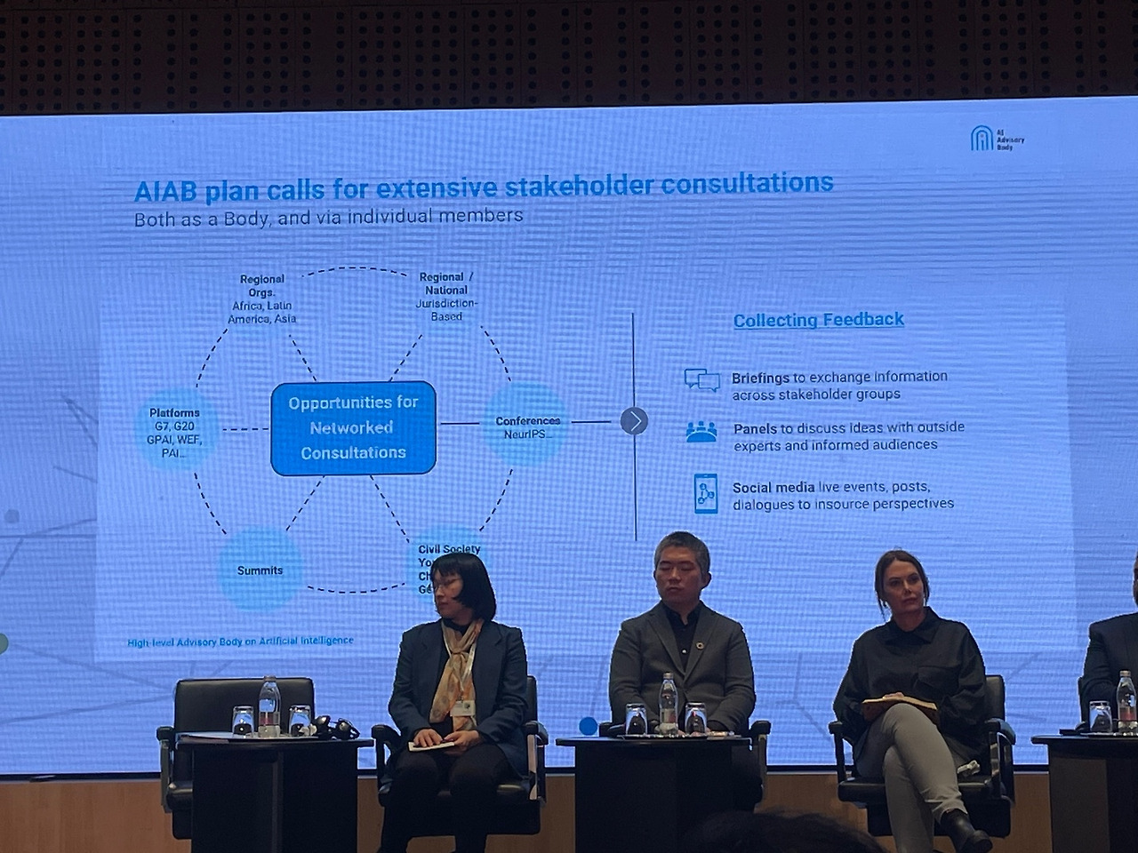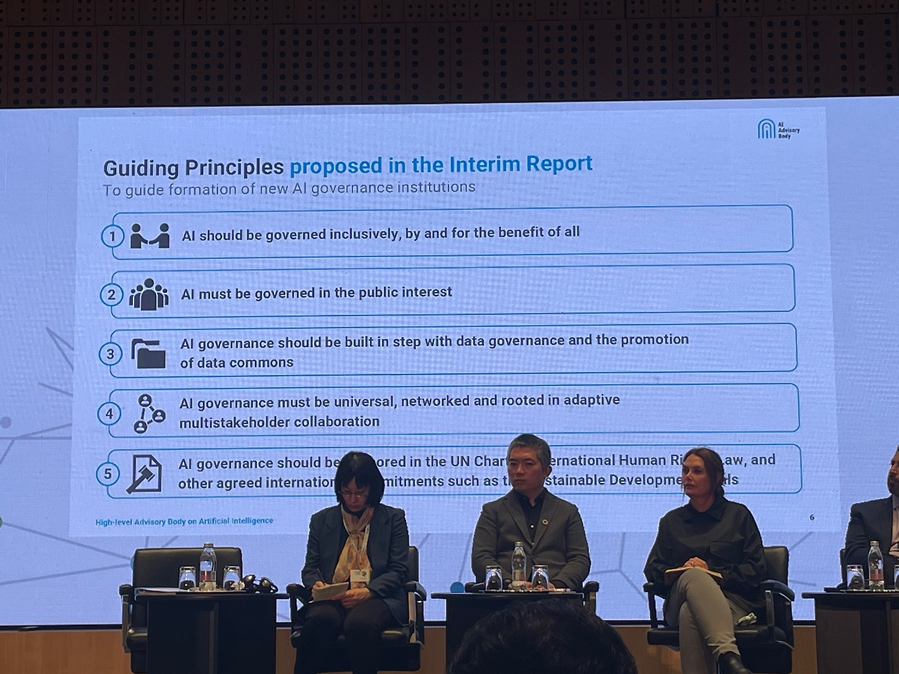 첫째 날 일정의 마지막은 유엔 AI 고위급 자문단의 중간보고서 발표와 포럼 현장 참석자들의 의견수렴으로 마무리되었다. 중간보고서의 핵심은 5가지 기본원칙과 원칙을 실행하기 위한 7단계의 구체적 실행 방안이었다. 7단계 실행방안은 손쉽게 바로 실천할 수 있는 1단계부터 실제 실행까지 힘든 난관이 예상되는 규범의 정교화 등 7단계로 구분되어 있는 점이 특징이었다.