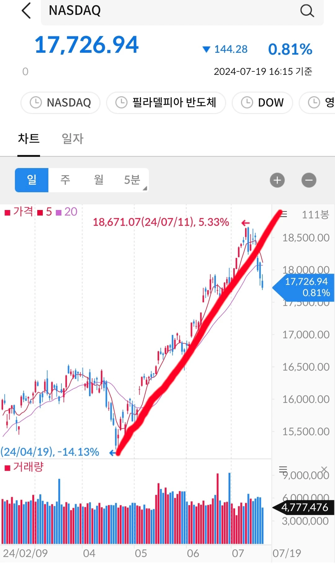 현재 나스닥이 커다란 조정을 보이며 낙폭을 확대하고 있습니다. 상승추세선마저 깨버린 지 오래고 이제는 전저점까지 두드리려 합니다.