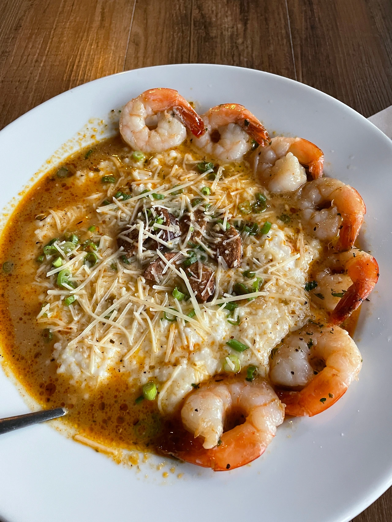 놀스 캐롤라이나는 좋은 학교라도 있고 (UNC) 많은 기업들이 이주하고 있어서 요즘 핫하다는 느낌이라도 있지 사우스 캐롤라이나는 사투리 무지하게 심한 남쪽 촌동네라는 느낌이 강하다. 콜롬비아에서 2시간 쯤 떨어져있는 찰스턴은 미국 남북전쟁의 첫 총성이 터진곳으로 사우스 캐롤라이나에서 가장 큰 도시이기도 하고, 바다를 끼고 있기도 하고 나름 콜로니얼 시절 빌딩 등 볼 것이 꽤 있다고 한다. 하지만 콜롬비아는... 사우스 캐롤라이나 주 자체는 담배 및 목화재배가 주력 사업이라고 한다. 역사적으로 노예제도를 오랫동안 옹호한 지역이라 그런지 그릿츠(grits)라는 음식이 지역 특색으로 자리 잡아있는데 간단하게 말하면 옥수수죽으로... 가난하던 시절 먹던 음식스러운 느낌이 진하게 난다. 맛이 없지는 않았는데 내 돈 주고 먹고싶은지는 잘 모르겠는 그런 느낌. 하지만 곁들여 나온 새우가 굉장히 탱글탱글 잘 구워나와서 만족스러웠다.
